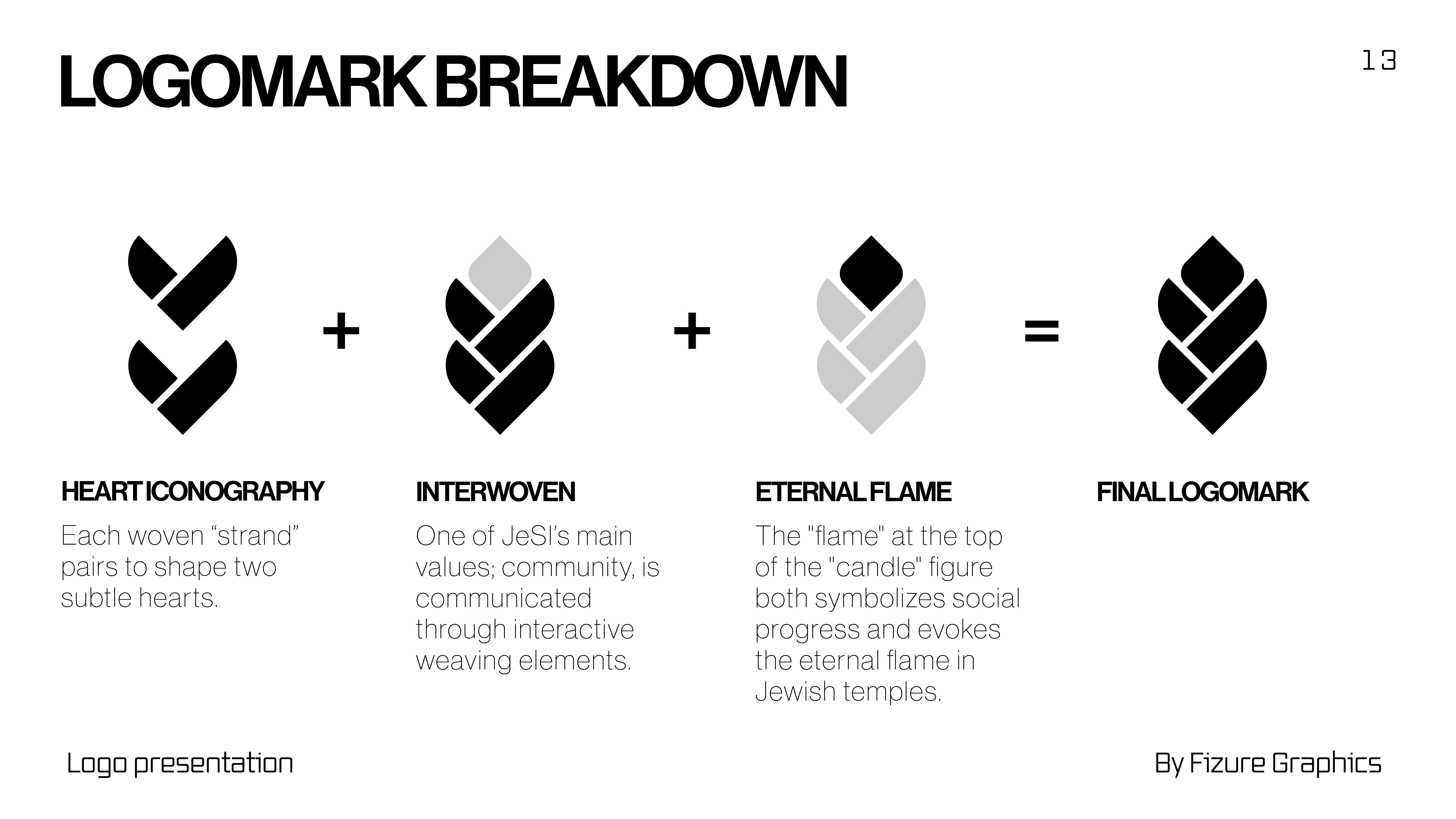 The final logo has a strong sense of humanness, an important aspect to foster a warm and welcoming community. Combining heart iconography, interwoven elements from the Challah Bread, and an eternal flame inspired from the Havdalah Candle, the monogram is a bold statement that stands out and welcomes new communities with open arms.